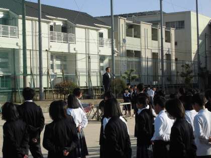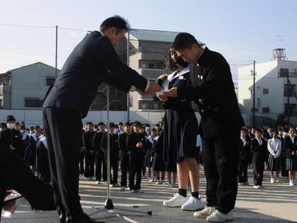 校長先生からは「体育大会では、みなさんが全力を尽くしている姿を見ることができました。週が明けて、今は大きな行事が終わって山を下りている途中です。次は何に目を向けるのかが大事です。本番当日頑張るのは誰でもできます。本番で本気を出すためには日常が大切です。先日の進路説明会では、教頭先生から授業中寝ている人の話がありました。心当たりのある人がいますね。自分をゆるめてもよいですが、自分に負けないようにしてください」というお話がありました。