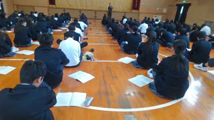 2年生は、4時間目に体育館で明日から実施する職場体験学習の事前学習を行いました。
