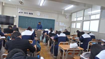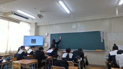 3年生、国語・数学の様子です。国語は漢字や語句の書き取りに集中して取り組んでいます。数学は2教室に分かれて分割授業を行っています。こちらの教室では関数の学習をしてます。