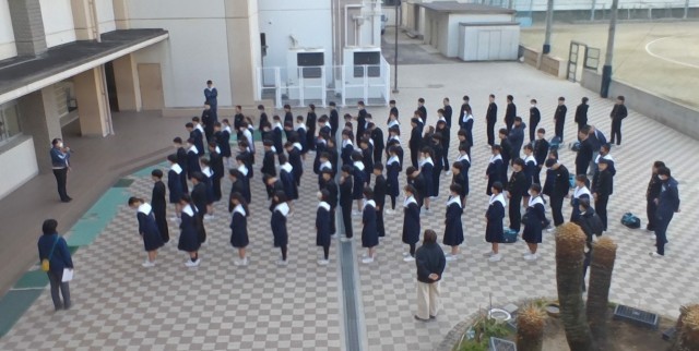 3年生は朝の学年集会がありました。いつもは体育館で行われるのですが、3学期に入って体育館のフロア張替え工事が行われているため、今日は中庭での学年集会です。昨日実力テストが終わり、次は26日、27日に卒業テスト(学年末テスト)があります。入試に向けてより一層出力を上げて頑張っていきましょう!!
