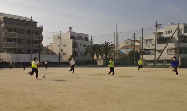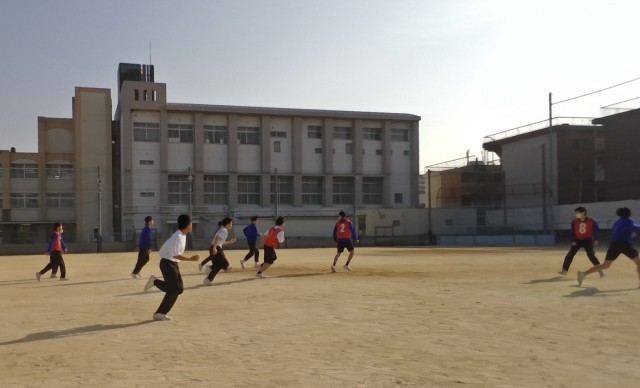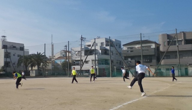 今日は小春日和であたたかいので、体育のサッカーではたくさんの生徒が半袖になってよく走っています。