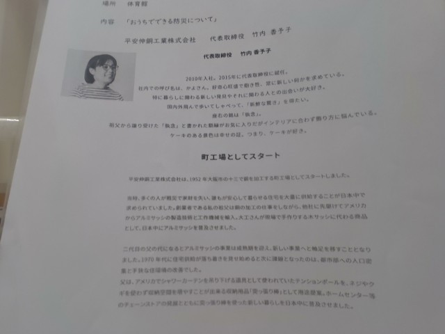 探求読解プロジェクトの出前授業で、平安伸鋼工業株式会社 代表取締役 竹内 香予子様をお招きし、『おうちでできる防災について』の講話をしていただきました。