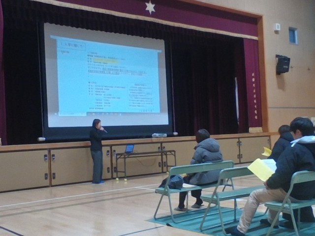 まずは、教務主任からはパワーポイントによる入学に際しての準備や中学校での教育活動についてお話がありました。
