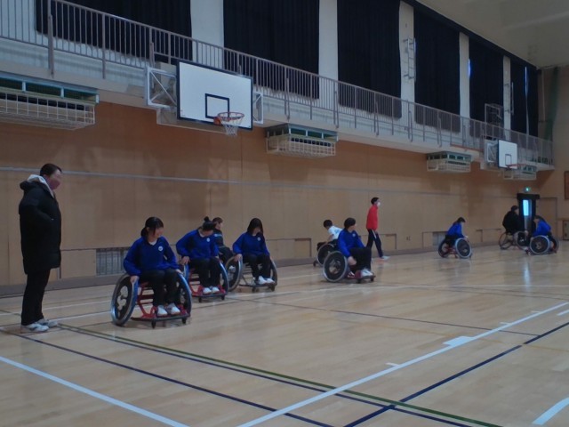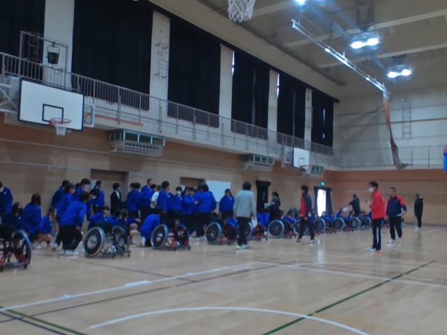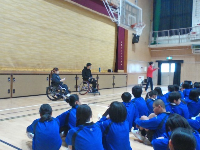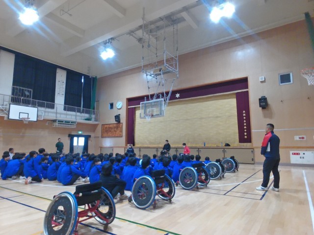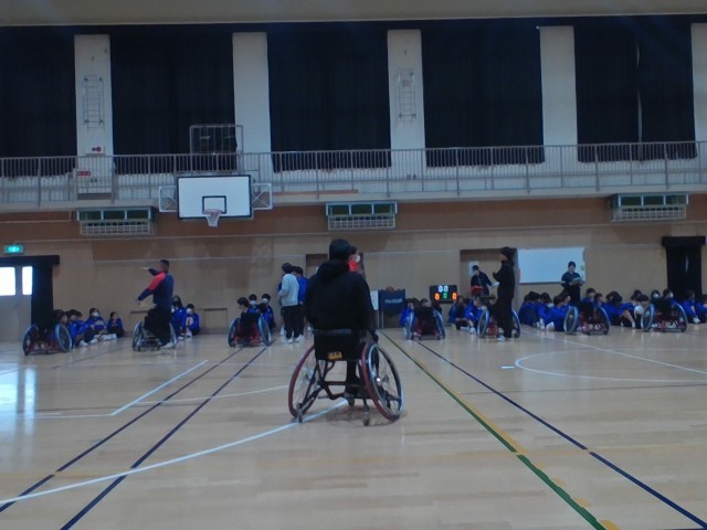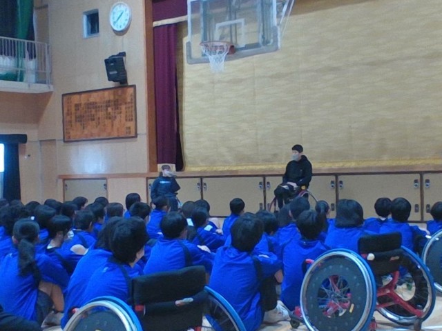 1年生車いすバスケットボールを体験しました。はじめにゲスト選手の挨拶から始まり、デモンストレーションを踏まえて丁寧な説明を受けました。
