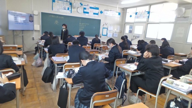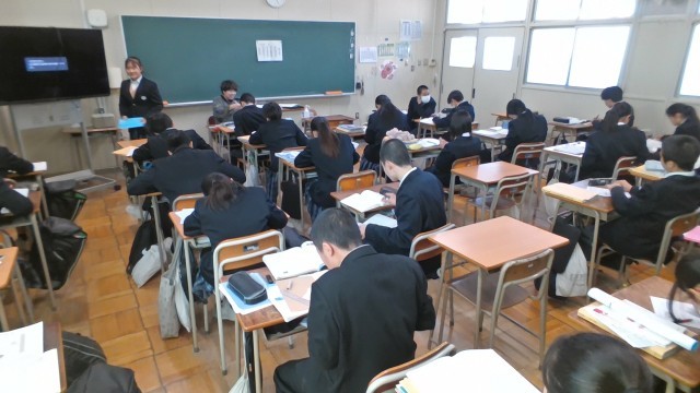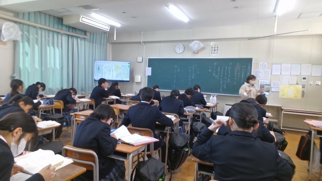 学年末テストまで1週間です。国語、英語、社会それぞれの授業でしっかりと学習しています。自習のクラスでもテストに向けて問題集や学習プリントに取り組んでいます。