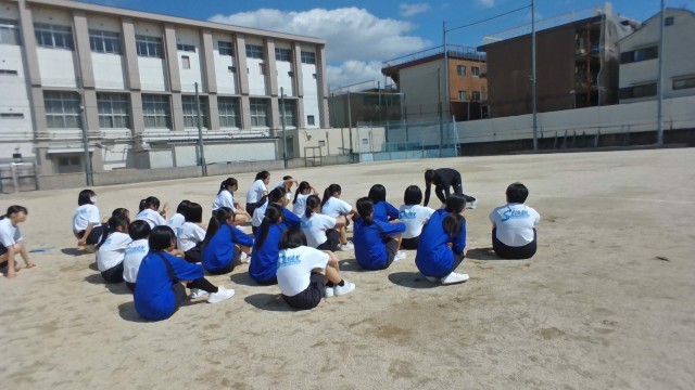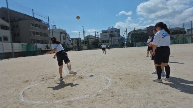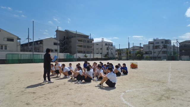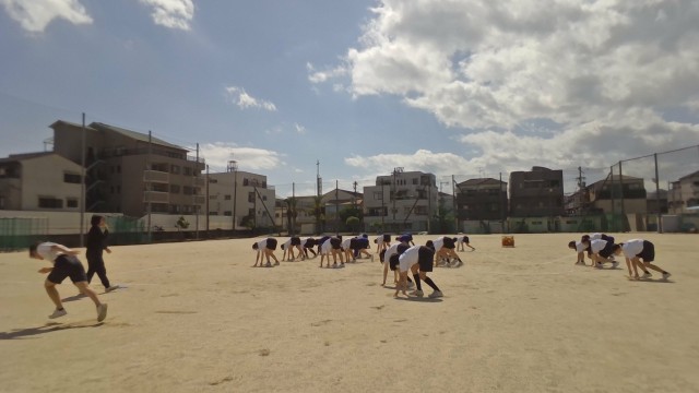 女子はハンドボール投げの測定のあと、次の種目の50M走に向けてスタート練習をしています。