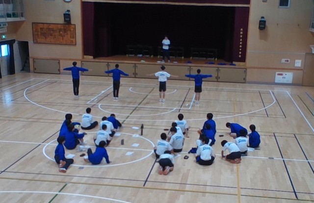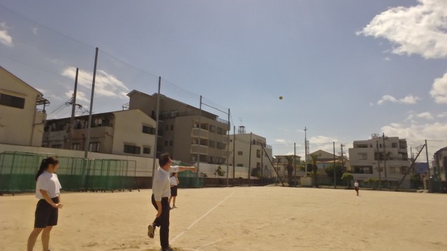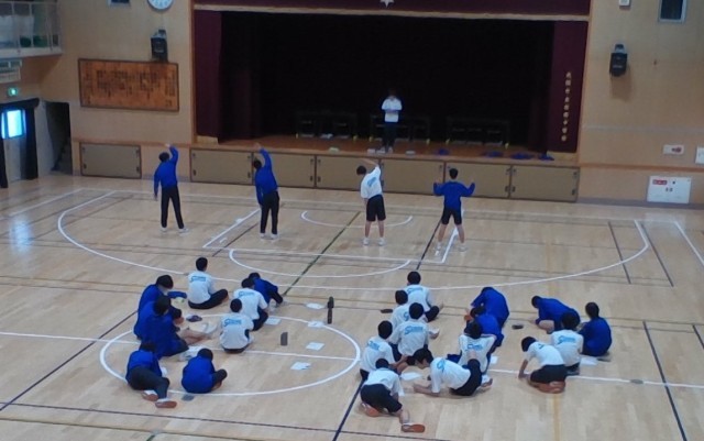 男子はラジオ体操のテスト、女子はスポーツテストの種目「バンドボール投げ」の測定をしています。