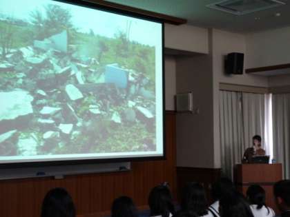 2013年に大阪市の中学校として初めて認定されたユネスコスクールの活動紹介、阪神・淡路大震災にもふれながらおこなった1・2年生の子防プロによる発表。