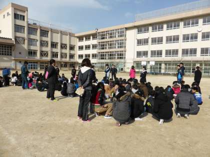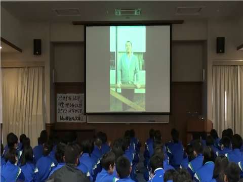 朝の集会では校長先生のあいさつ、阪神・淡路大震災の犠牲者への黙祷の後、昨年11月に来られた臼沢さんのビデオレターや取り組みの内容説明をおこないました。