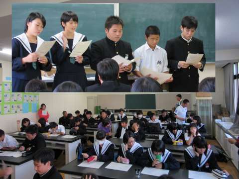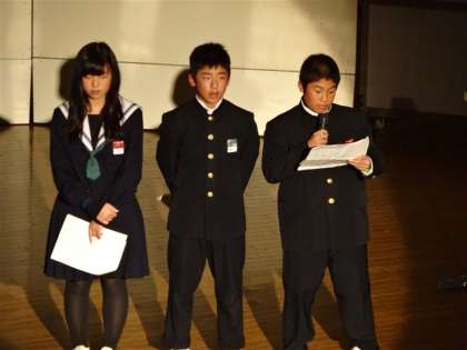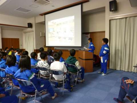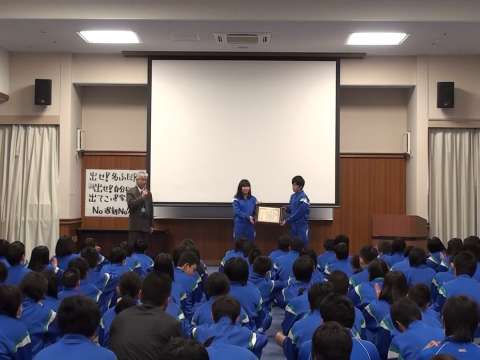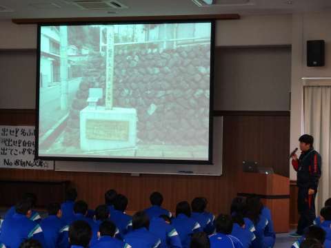 11日に開催された「ぼうさい甲子園」の表彰式の報告、そして3年生のリーダーによるメッセージ・鶴中未来宣言を発表しました。