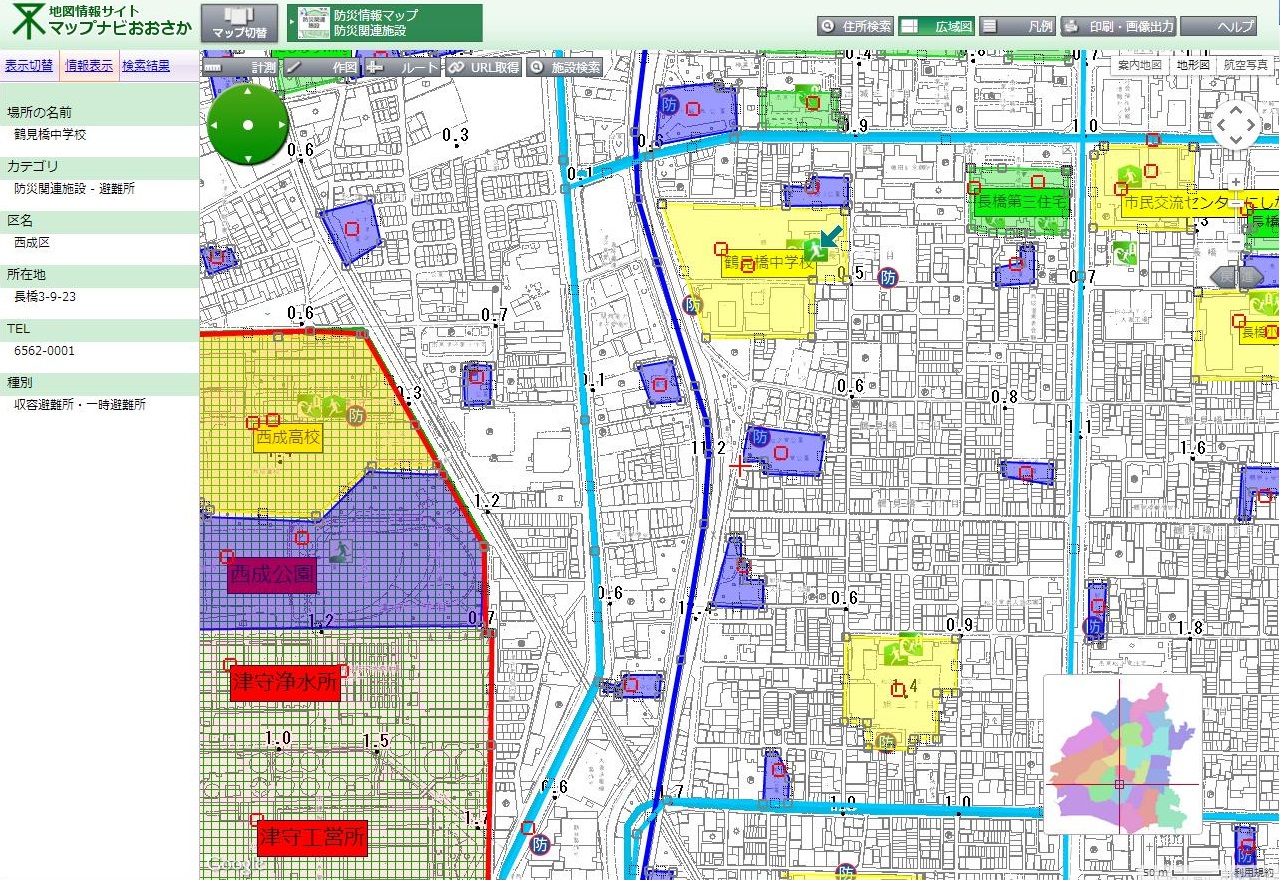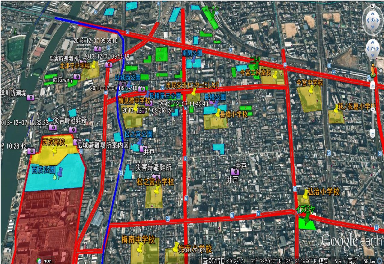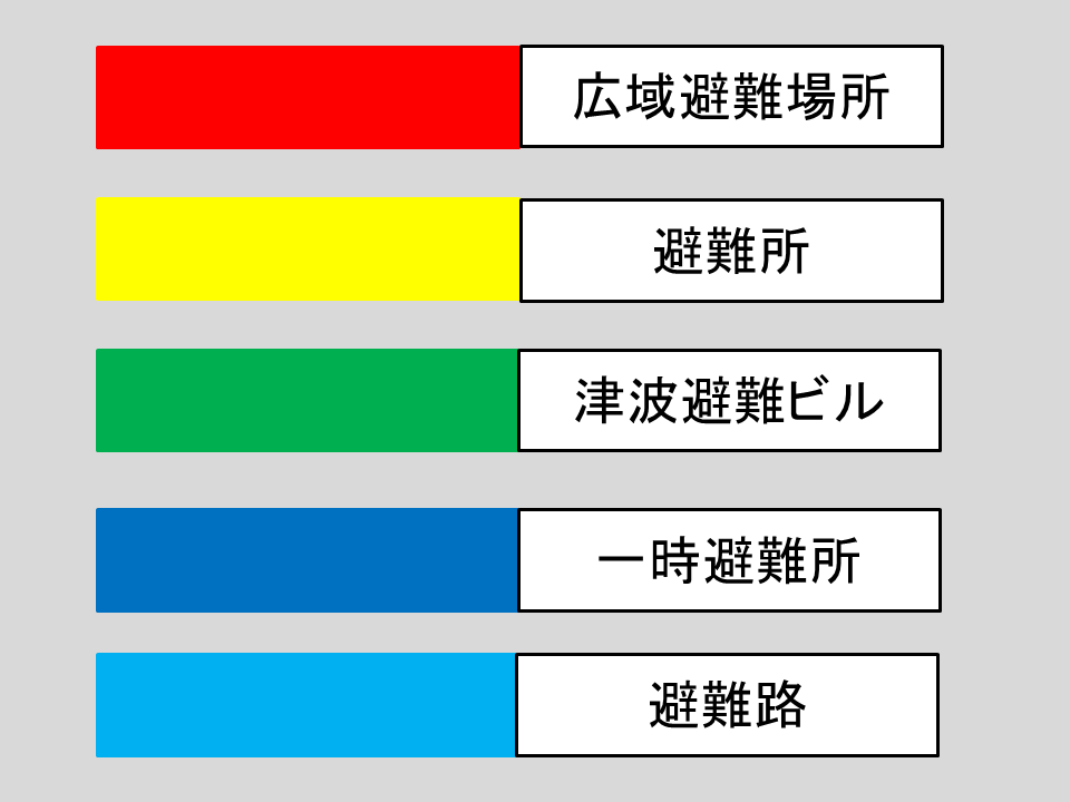 防災マップの作成では学校などの避難所津波避難ビル、公園、避難路などをマーカーなどで示してあります。