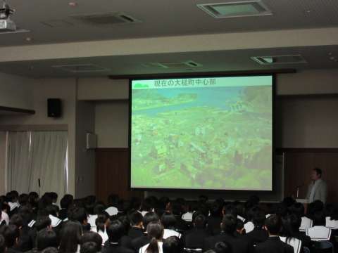 まず始めに3Dによる映像を見て、災害時どのように行動したらよいか、濱口梧稜さんの功績を学びました。