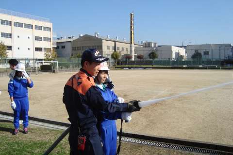 地震を想定した通常の訓練、多目的室に避難・集合した後、西成消防署からのご講評をいただくとともに、兵庫県から大学生の小島汀さんを特別講師として招き、講話をしていただきました。