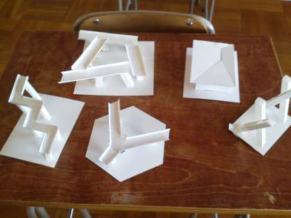 今回は、のぼりに見える坂道をビー玉がのぼったり、傾斜のある屋根の真ん中にビー玉がとどまったりと、実際にはありえない立体を作成しました。