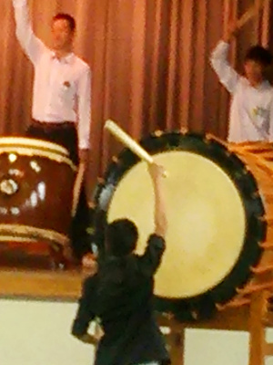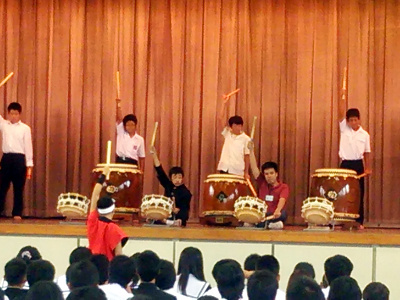 各学年の体験希望者は舞台に上がり、和太鼓演奏にチャレンジしました。