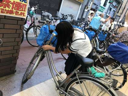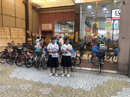 地域にあるスーパーの前で自転車のカゴにカバーをかけたり、防犯のチラシの配布を行いました。