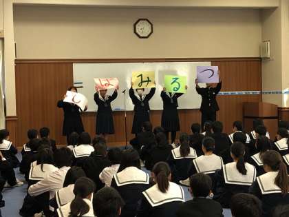 校長先生のお話の後、生徒会から、後期のスローガンが掲げられました。