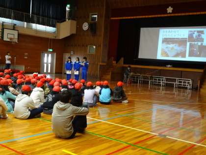 今回は11月7日・8日に鶴中でおこなった第3回避難所訓練合宿での学びを、小学生や地域の人たちに紹介しました。臼沢さんからのメッセージや合宿に参加した子防プロメンバーの想いを伝え、避難訓練には真剣に取り組むよう呼びかけました。