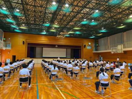 今日の全校集会は、1時間目に体育館で、いじめについて考える集会を行いました。