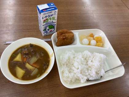 初日の今日は、カツカレーライスとフルーツ白玉のお祝い献立です。