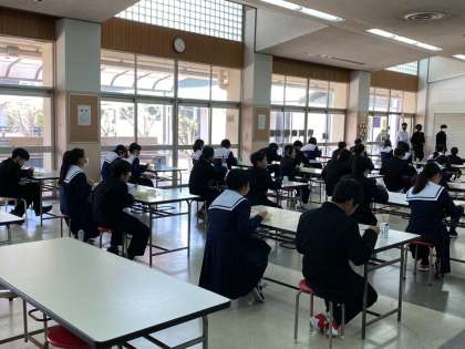 鶴見橋中学校は食堂に移動して、全校みんなで給食を食べています。