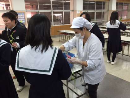 3年生から配膳員さんへ感謝の気持ちを伝えました。配膳員さんからも、「給食が改善されずにすみません」、「あたたかい学校だなと感じました」という言葉と3年生全員にお祝いのお花をプレゼントしていただきました。配膳員さんのこのような気持ちが、よりよい給食につながると思います。
