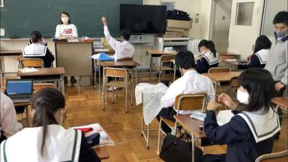 1年生、4時間目、家庭科「「刺し子で三角巾を作ろう」です。