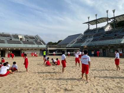 みんなで裸足になって、ビーチバレーやサッカーを楽しんでいます。