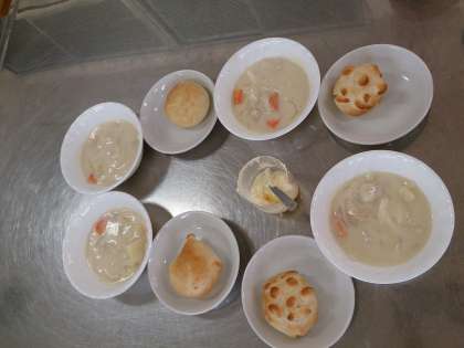 シチューの素も使わず、パンも強力粉からこね、バターは生クリームをふって作ります。