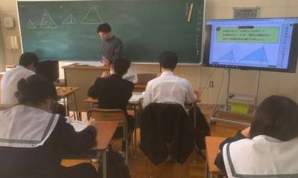 11月29日(月) 3年生 2時間目 数学 「相似な図形の相似比と面積比」の授業の様子です。