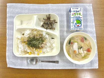 給食の「ぞう煮」には、金時にんじんやさといもが入っており、白みそで味つけしています。
