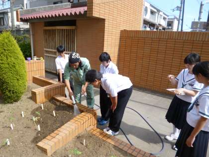 最後に生活環境委員が管理作業員さんにひまわりの世話の仕方を教えていただき水やりをしました。