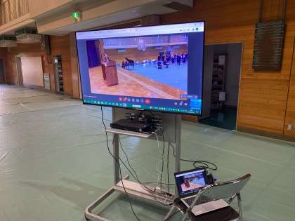 ICT機器を利用して、舞台上の様子を会場内のモニターに映しております。ご覧ください。