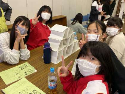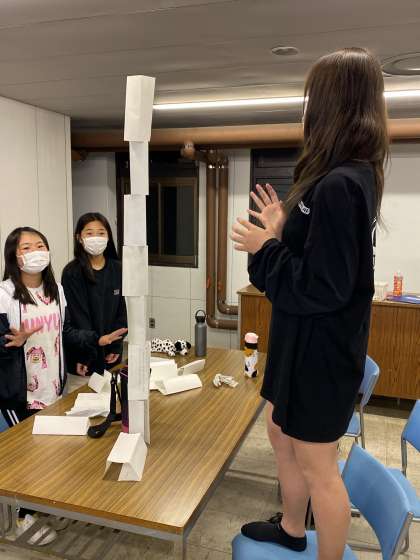 ペーパータワー対決では、班ごとに工夫を凝らして、高さを競いました。