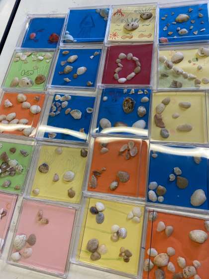 その貝殻を拾い集めて、画用紙に貼り、ディスクケースに入れて貝殻アートを作りました。