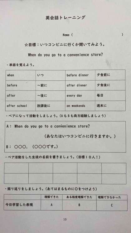 単数形・複数形などの文法事項を学習し、whenを使った疑問文で、「いつ〜するか」を尋ねる会話練習を行いました。