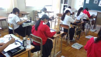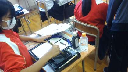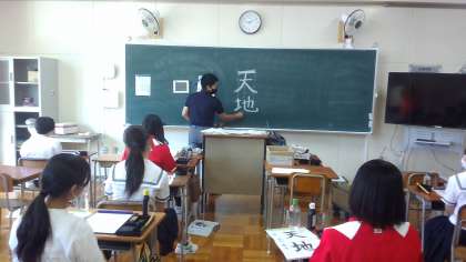 線を書く練習をした後、先生より字のバランスのポイントの説明があり「天地」を書きました。