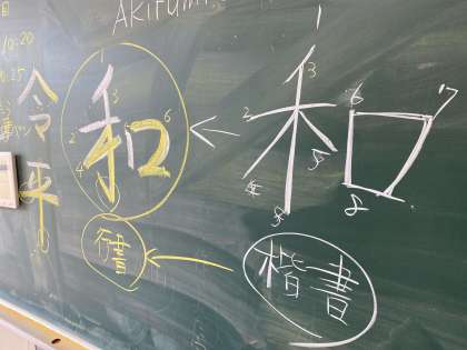 漢字の成り立ちについて知り、「和」という字の楷書と行書のちがいをとらえながら練習をしました。
