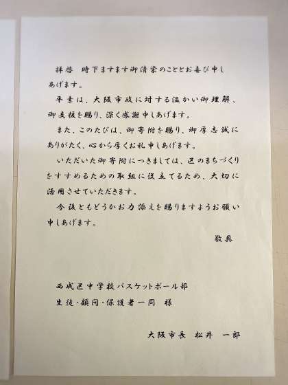 その西成リーグの活動と寄附について、この度、大阪市長よりお礼状をいただきました。