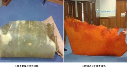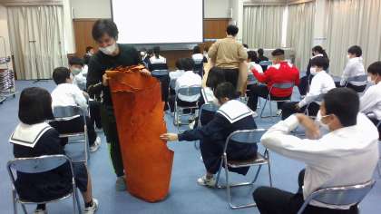 鞄、靴、太鼓等 高級ブランド品となる元の革は、ここ西成区と浪速区が過去最大級の製造地でした。皮から革になる工程と、その高い技術を身に着ける為何年も修行が必要と説明がありました。その革を使って美術の授業で革の小物作りの製作にはいります。