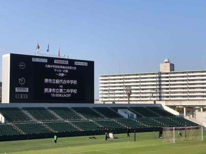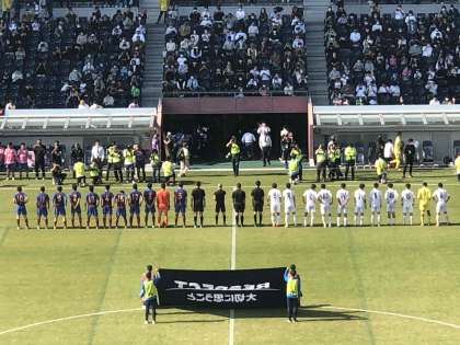 高校サッカーの前座試合ということで、プロのチームと同じピッチで試合が行われました。両チームは最後の公式戦ということもあり、白熱しながらも楽しそうにしている様子が印象的でした。