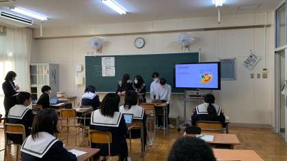 家庭科では、栄養に関する発表を行いました。班ごとに分かれ、家族構成などを想像した上で、それぞれ献立を考えました。
