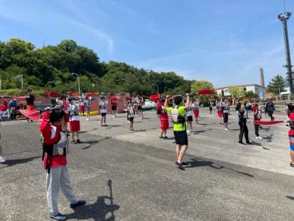 乗船前に、みんなでカヌーの漕ぎ方を練習しています。