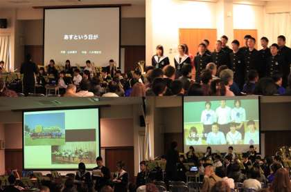 そして復興を願って作られた『明日という日が』という曲を音楽部の演奏で、有志の3年生、先生方が一緒に歌ってくれました。時間のない中、合間をぬって各自が練習していただき、当日心からの歌声を会場に届けてくれました。