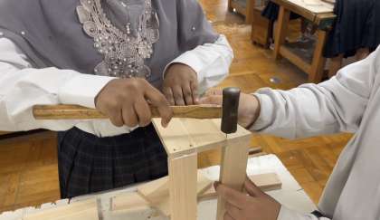 加工しておいた木材に穴を開け、友だちと協力し合って、順番にくぎを打つことができました。