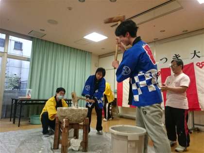 「皆様の健康を願いましてつかせていただきます」「よいしょ〜っ!」 生徒のかけ声とともに杵(きね)が振り下ろされ、入居者の方と一緒に相づちを打ちました。「中学生はやっぱり力があるなぁ。」と感心する方も多く、つき終わった時に「また頼むで!」と声をかけてもらうほど、すごい迫力がありました!