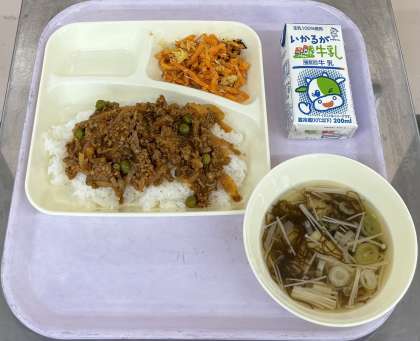 給食では、細切りにしたにんじん、ささみ、かつおぶしと調味料を混ぜ合わせ、焼き物機で焼きます。卵は使用していません。
