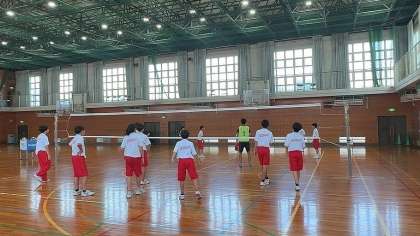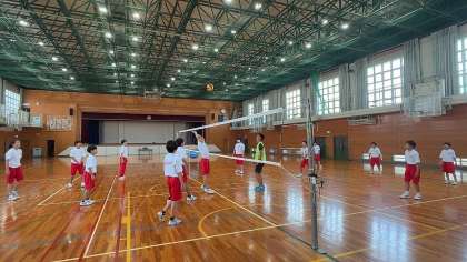 男子の体育では、チーム対抗でバレーボールの試合を行いました。