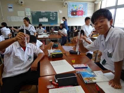 静かな教室に、コポコポという石灰水に呼気をふきこむ音だけがするのは、なんともシュール。おもわず、吹き出して大爆笑へ!そんなこんなで、それぞれの石灰水が白くにごり、二酸化炭素の性質を学ぶことができました。
