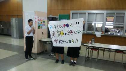 認証式に先だって行われた13日(木)の後期1回目の執行委員会では、マニフェストとスローガンを話し合いました。決定したものは給食時に披露し、その後玄関前に掲示をしています。